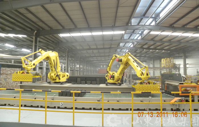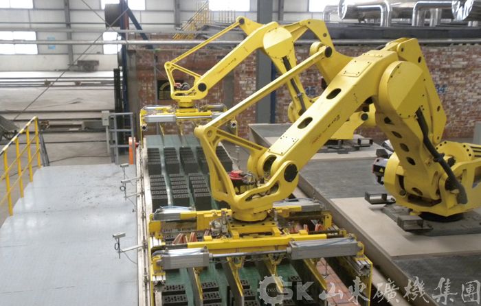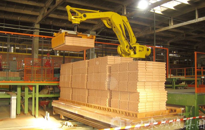 機(jī)器(qi)人(ren)自動(dòng)碼坯係(xi)統主(zhu)要适用(yong)于(yu)新(xin)型建(jian)築材(cai)料廠(chǎng)磚坯的(de)切割、運輸(shu)、碼放、卸垛及(ji)受場(chang)地限(xian)製(zhi)的(de)老磚廠(chǎng)實現(xian)自動(dòng)化碼坯生(sheng)産(chan)線(xiàn)的(de)改造(zao),碼坯機(jī)器(qi)人(ren)具(ju)有(yǒu)投(tou)資(zi)小(xiǎo)、耗能(néng)少、穩定性高(gao)、運轉靈(ling)活,占地空間小(xiǎo)等(deng)特點,與窯型及(ji)多(duo)功能(néng)編組的(de)配(pei)套靈(ling)活,可(kě)滿足不同産(chan)量下碼坯及(ji)卸磚需求。該係(xi)統采用(yong)的(de)機(jī)器(qi)人(ren)運動(dòng)靈(ling)活、準确度高(gao)、承(cheng)載力(li)大(da),其高(gao)靈(ling)敏度碰撞檢(jian)測(ce)功能(néng),可(kě)以(yi)瞬時檢(jian)測(ce)出碰撞并緊急停機(jī),可(kě)有(yǒu)效防止因碰撞引起的(de)對機(jī)械手咊(he)物(wù)品(pin)的(de)損害。