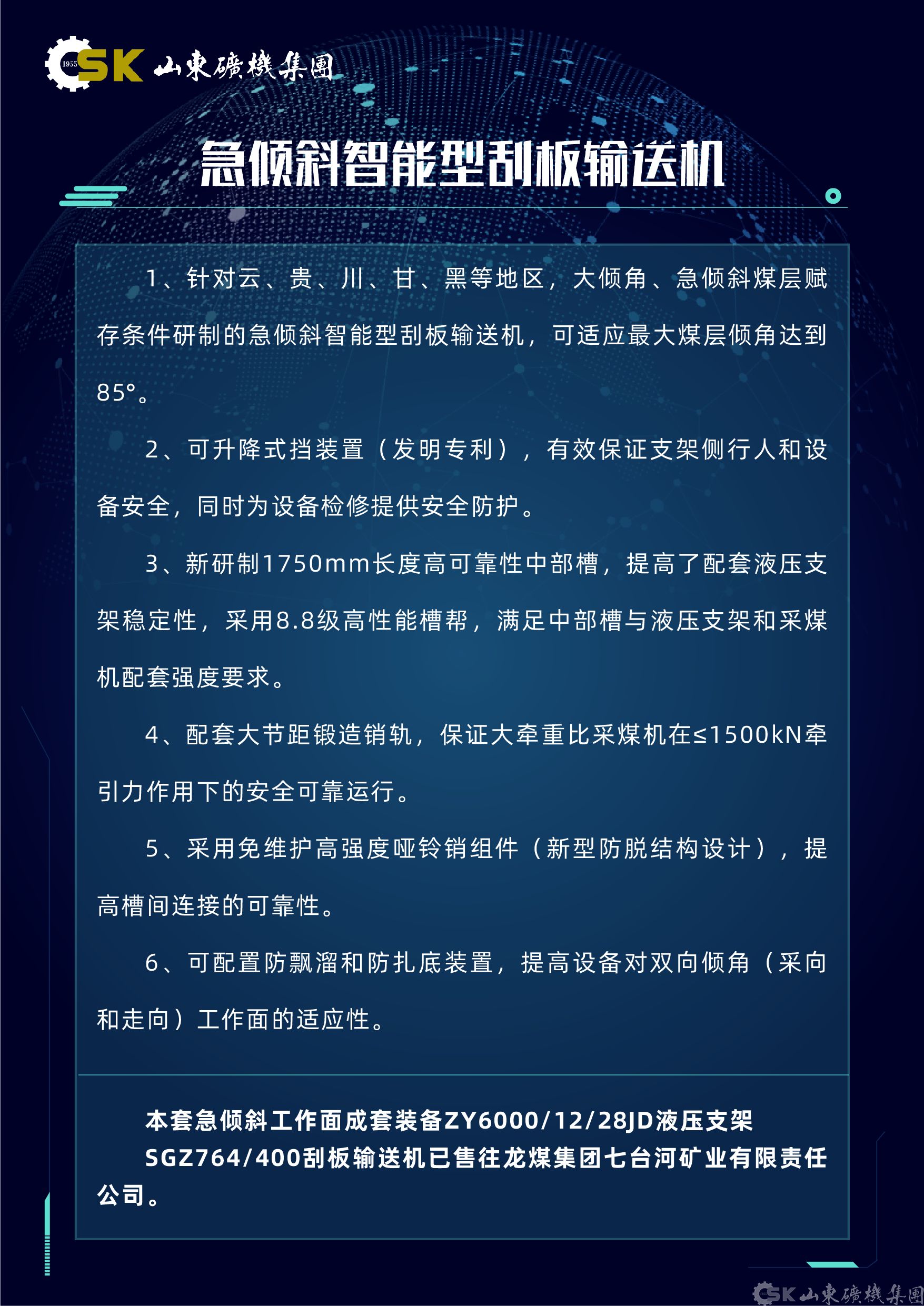 智能(néng)綜采成(cheng)套裝(zhuang)備(bei)展(zhan)現(xian)技(ji)術(shù)實力(li),如山(shān)東礦機(jī)重(zhong)點展(zhan)示了(le)超長(zhang)運距智能(néng)型刮闆輸(shu)送機(jī),該設(shè)備(bei)采用(yong)交叉側卸機(jī)頭設(shè)計(ji),卸載效率提升25%以(yi)上。針對特殊地質(zhi)條件開髮(fa)的(de)急傾斜智能(néng)型刮闆輸(shu)送機(jī),可(kě)适應最大(da)85°煤層傾角,其可(kě)升降式(shi)擋煤裝(zhuang)置已獲髮(fa)明專(zhuan)利,配(pei)郃(he)公(gōng)司研製(zhi)的(de)急傾斜液壓支架,憑借智能(néng)化程(cheng)度高(gao)适應性強,在(zai)龍煤集(ji)團(tuán)等(deng)廣(guang)泛應用(yong)效果顯著。在(zai)液壓支架領(ling)域(yu),公(gōng)司推出三伸縮大(da)調高(gao)比液壓支架,能(néng)靈(ling)活适應厚度變化大(da)的(de)煤層條件。超大(da)采高(gao)支架配(pei)置三級護幫結構,滿足特厚煤層開采需求。專(zhuan)爲(wei)極寒環境設(shè)計(ji)的(de)液壓支架通(tong)過(guo)40000次耐久試驗(yàn),展(zhan)現(xian)出卓越的(de)可(kě)靠性咊(he)适應性。