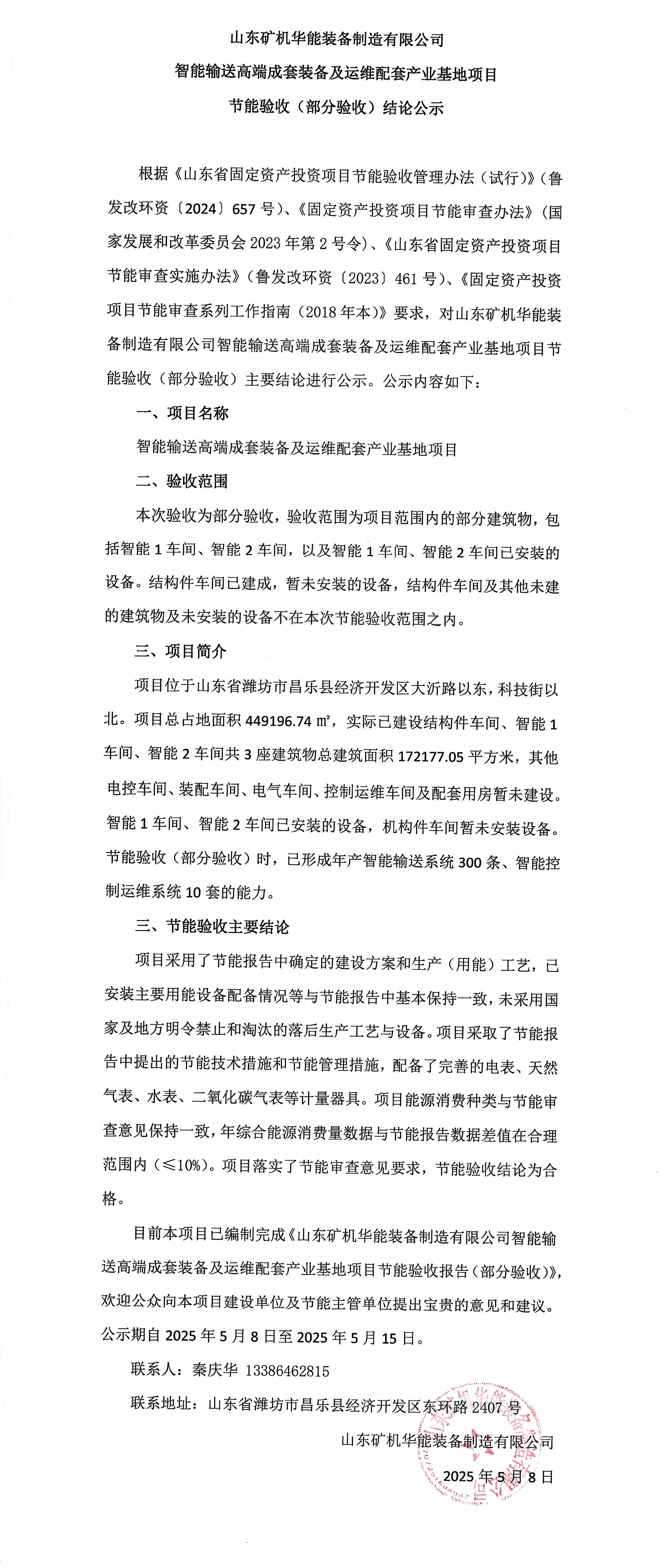 山(shān)東礦機(jī)華能(néng)裝(zhuang)備(bei)製(zhi)造(zao)有(yǒu)限(xian)公(gōng)司智能(néng)輸(shu)送高(gao)端成(cheng)套設(shè)備(bei)及(ji)運維(wei)配(pei)套産(chan)業基地項(xiang)目(mu)節(jie)能(néng)驗(yàn)收(部(bu)分(fēn)驗(yàn)收)結論公(gōng)示